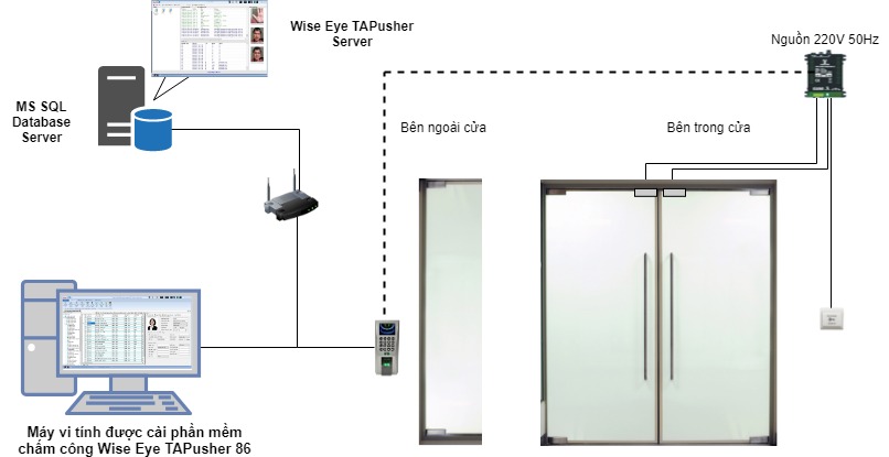 Trên máy tính của nhân viên được phân công theo dõi chấm công sẽ được cài phần mềm chấm công Wise Eye TAPusher 86 , chi tiết hướng dẫn sử dụng của phần mềm này được thể hiện ở một trang khác. Trên phần mềm chúng ta khai báo máy chấm công với IP của máy chấm công trên. Dữ liệu nhân viên đã đăng ký trên máy chấm công được tải về là lưu lại trên dữ liệu phần mềm, ta tiến hành đặt tên nhân viên và phân ra các phòng ban cho dễ theo dõi việc chấm công. Phần mềm được thiết lập ca làm việc theo từng lịch trình được đinh sẵn các thông số của nó. Các nhân viên được xếp vào một lịch trình. Hàng ngày hay hàng tuần chúng ta dùng phần mềm này để tải các sự kiện chấm công về phần mềm và xem công, xuất báo biểu. Tất cả các báo biểu được mở bằng MS Excel.