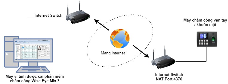 Phần mở rộng có mô hình bên trên. Máy công ở một nơi khác địa điểm cài phần mềm mà cần đưa dữ liệu chấm công về phần mềm. Tại nơi lắp máy chấm công chúng ta cần mở cổng (port) kết nối máy chấm công ( mặc định là 4370) ra ngoài Internet. Khi đó phần mềm sẽ khai báo IP WAN của router tại nơi lắp máy chấm công. Trường hợp IP WAN là một IP động thì chúng ta cần một tên miền để thay thế, hiện nay Dyn và NoIP là dịch phổ biến được tích hợp hầu hết các router trên thị trường. Nhìn lại thì ta thấy ở giải pháp này nếu có nhiều máy chấm công ở nhiều nơi khác nhau thì tốn rất nhiều công sức để quản lý việc mở cổng kết nối cho từng điểm và có thể tốn nhiều chi phí cho việc thuê tên miền. Khắc phục điều này mời quý vị xem chi tiết ở Giải Pháp 2