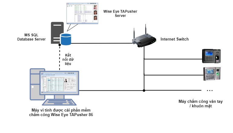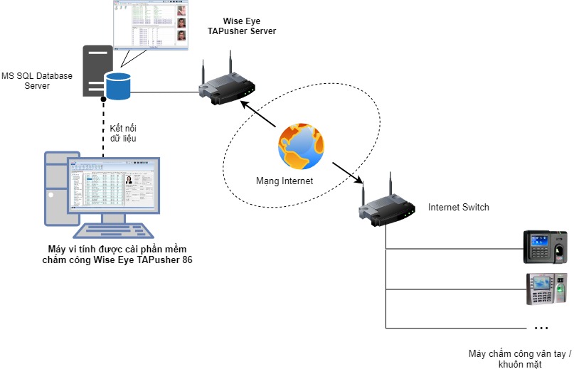 Phần mở rộng có mô hình bên trên. Máy công ở một nơi khác địa điểm cài phần mềm mà cần đưa dữ liệu chấm công về phần mềm. Tại nơi cài phần mềm, chúng ta mở cổng (port) của phần mềm Wise Eye TAPusher Server ra ngoài Internet. Các máy chấm công được khai báo địa chỉ IP WAN của router tại nơi cài phần mềm máy chủ. Trường hợp IP WAN là một IP động thì chúng ta cần một tên miền để thay thế, hiện nay Dyn và NoIP là dịch phổ biến được tích hợp hầu hết các router trên thị trường. Như vậy trong trường hợp này nếu chúng ta lắp nhiều mày chấm công ở nhiều nơi khác nhau thì chỉ tốn công duy nhất mở một cổng kết nối cho phần mềm.